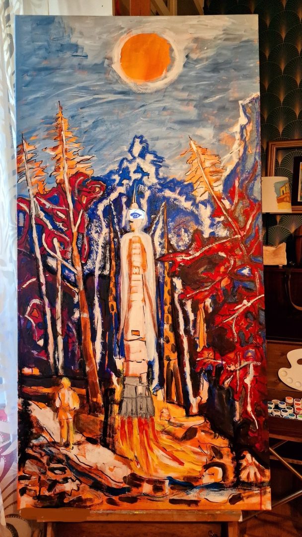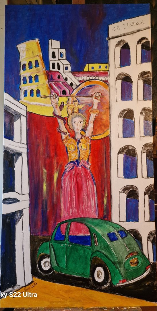 Many group exhibitions... I will only remind you of the most recent ones held at the gallery "Associazione Multifunzionale AReM M - APS" by Amelia Mutti in Garbatella, via Candeo 18: "100 Years of Radio", "The Future is Now", "Angels", Architecture and neighborhoods. And now: "Traces of Tomorrow," a splendid oxymoron, to which my work "Beyond the Wall No. 1" connects. Life could be a carefree present; a wall separates us from where the most hidden desires emerge from the past; the dormant fear of a dreadful future.