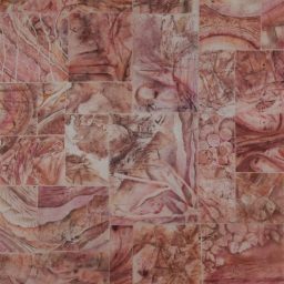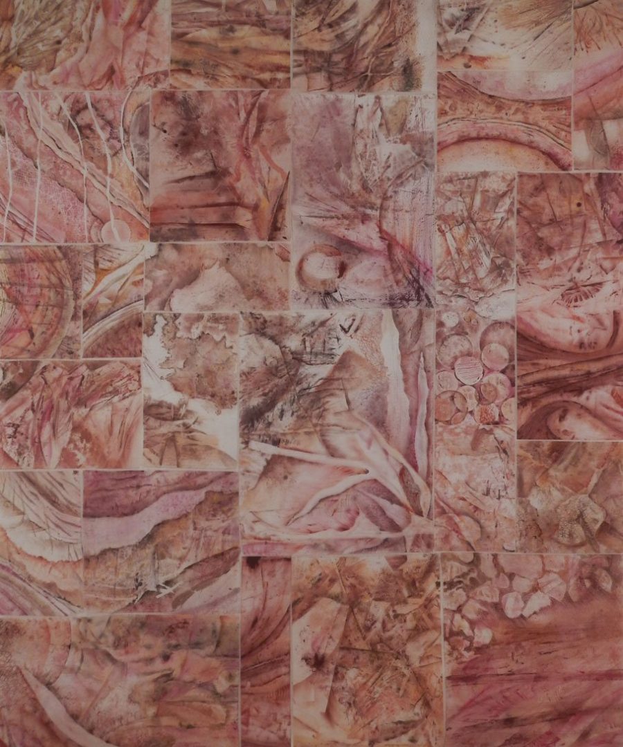 The technical choices are part of the Sabìr concept. Use of dismissed fabrics, woven with natural threads such as cotton, linen and silk. Sheets, tablecloths, curtains, recovered from old trousseaus already worn out by experience, are tattered in the conceived sizes for the final composition of the work. Use of professional colors for textiles: the selected colors and tones are made by mixing concentrated pigments with a soft and transparent base and water, and by adding a catalyst that increases the polymerization. The mixed technique affords a heterogeneity of signs meant to represent singularity in multiplicity. And like the spoken word, the sign drawn on the fabric cannot be taken back, as the used colors dye immediately. Use of gauze: after several experiments, the gauze, tenacious but invisible, handled and cut in the right sizes, was chosen to bind the composition and restore the kaleidoscopic representation of a collective narration.