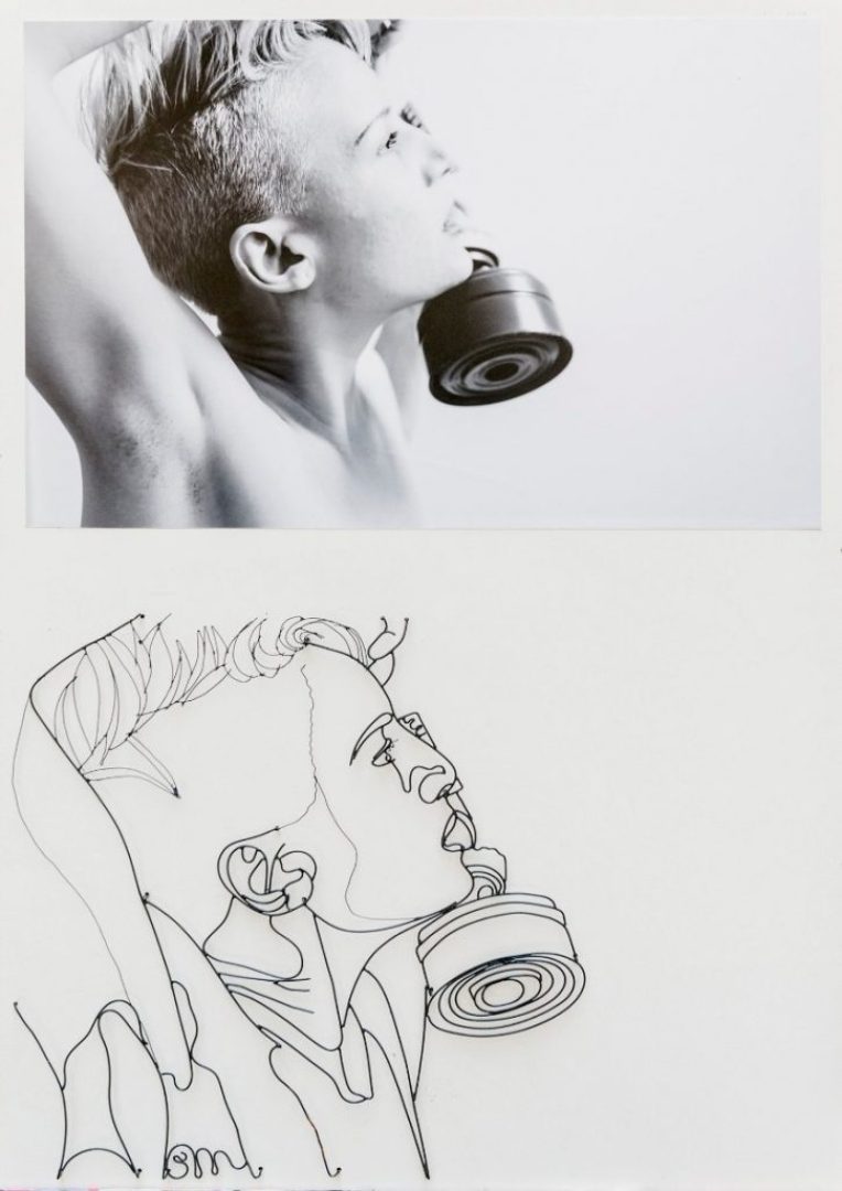 Fantozzi’s work introduces a first form of duplication: the self‑portrait as a split of body and role, in which the artist is simultaneously subject and operator of the image. Melappioni’s sculpture intervenes on this structure by adding a second level, not as a simple overlay but as a translation of the figure into another grammar. The iron does not replicate the photograph: it isolates directions, tensions, postures, producing a line that does not describe but interprets.