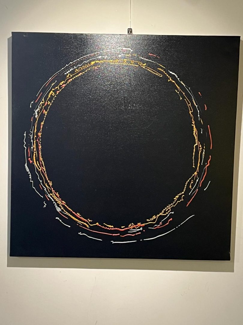 C’è una tensione continua fra istinto e misura, fra la forza di un segno che vuole dire tutto e il silenzio di un vuoto che non pretende di spiegare niente. Alcune opere nascono dall’irruenza – il rosso, il giallo, il nero che si inseguono e si respingono – altre dalla calma di un gesto controllato, quasi meditativo. Ma sempre, in fondo, torno lì: al cerchio incompleto, alla sua promessa di totalità e alla sua accettazione dell’imperfezione.