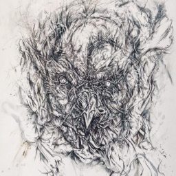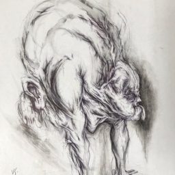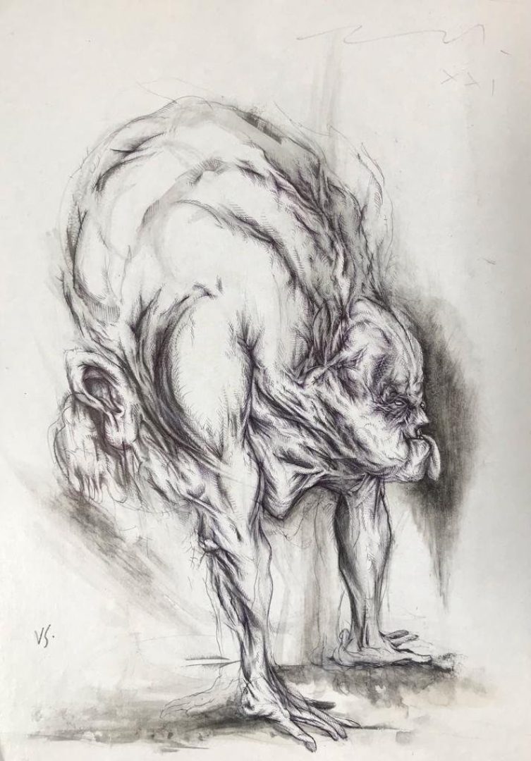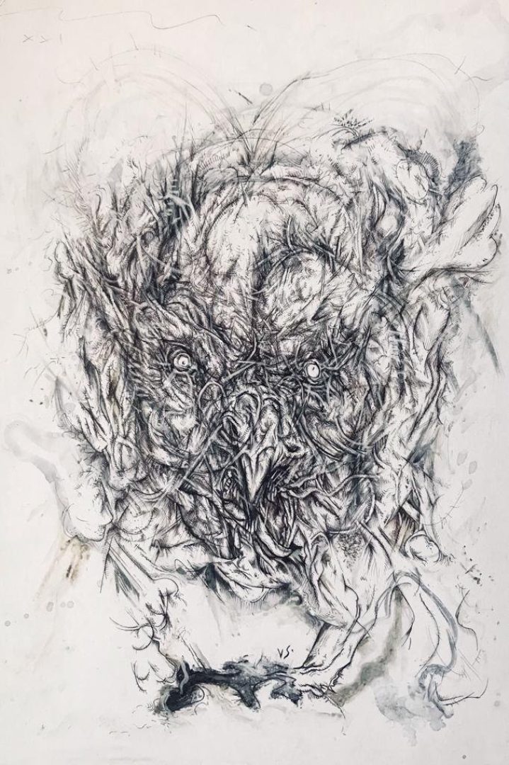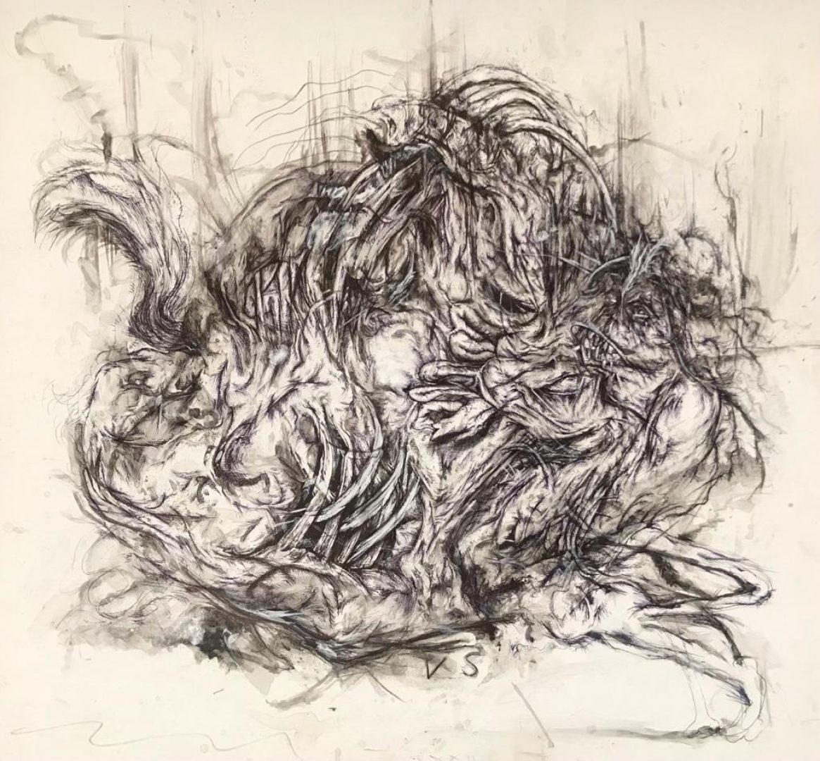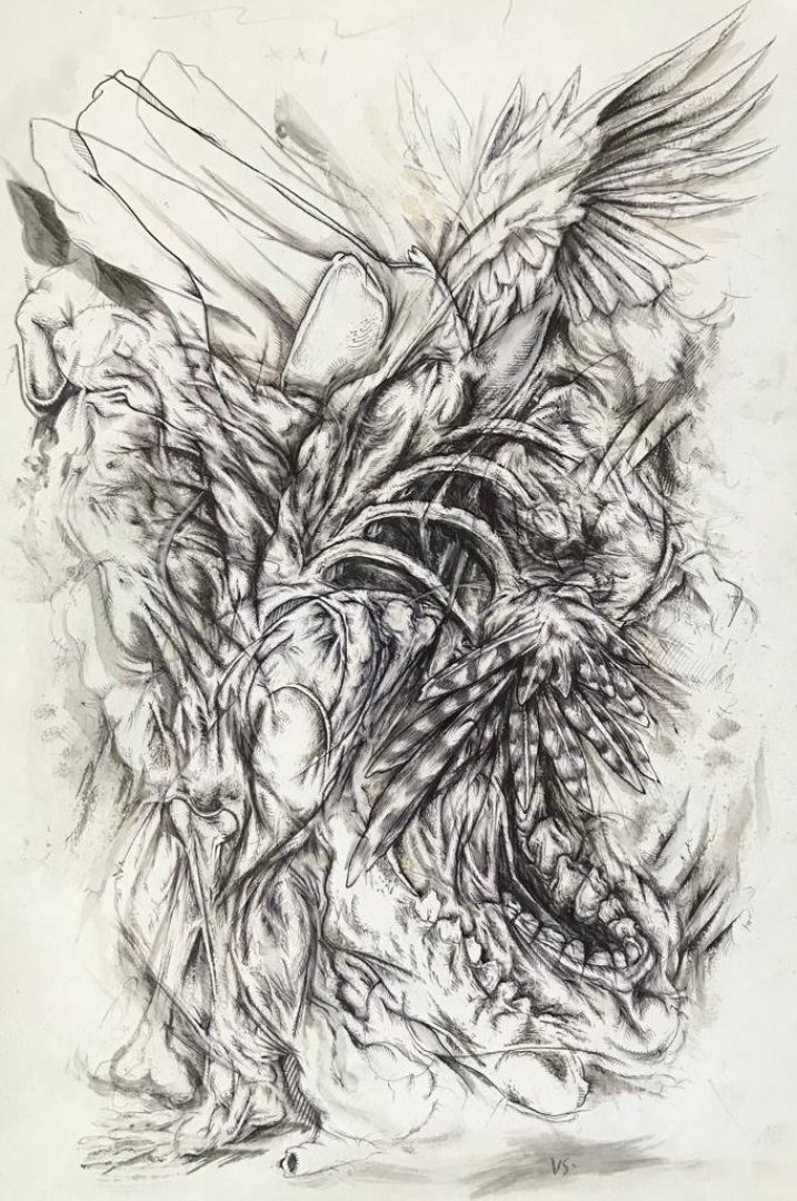 Sono nato nel 1986 a Città del Messico e ho iniziato nel 2005 la mia specializzazione in grafica e incisione senza abbandonare il disegno e la pittura, avendo l’opera di José Luis Cuevas come mio principale riferimento: un artista messicano di fama mondiale, protagonista della rottura con il muralismo messicano e principale rappresentante del neofigurativismo.Altri miei riferimenti sono Markus Lüpertz, Georg Baselitz, ma anche i maestri dell’arte povera. Il cinema gioca per me delle suggestioni speciali, soprattutto nei film di David Cronenberg e Luis Buñuel. Anche la literatura, dove ho a Samuel Beckett come la mía principale referenza.Già da queste poche righe si capisce che il mio principale mezzo espressivo è le cose grafiche, a volte sofisticate a volte molto grezza, con dei richiami non necessariamente realisti visivamente scioccanti.Le mie figure nascono dall’inconscio e appartengono a tutti noi: la violenza visiva delle mie immagini risponde alla violenza della nostra società. Credo che la lotta e lo scontro ci appartengano in maniera ancestrale e sento che la mia mascolinità del XXI secolo sia ancora profondamente legata a quella dei miei antenati, quando ciascuno combatteva per difendere la propria famiglia e per conquistare il cibo. Anche se la nostra società attuale è più confortabile, non siamo molto diversi dai nostri predecessori della preistoria e le pulsioni umane di base sono sempre quelle. In questa battaglia quotidiana ciascuno combatte come può: le mie armi sono le matite e i pennelli per rappresentare quei mostri che abbiamo nascosto al fondo della nostra anima, ma che sono sempre presenti.