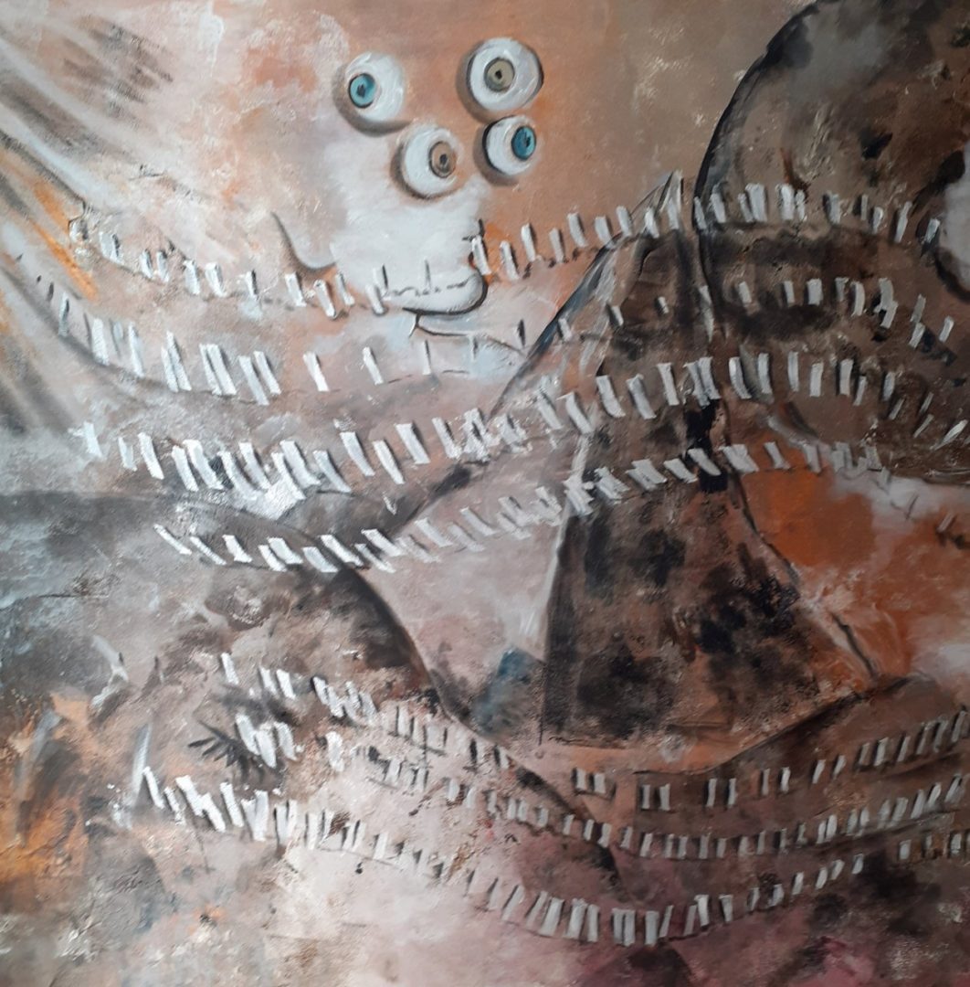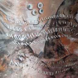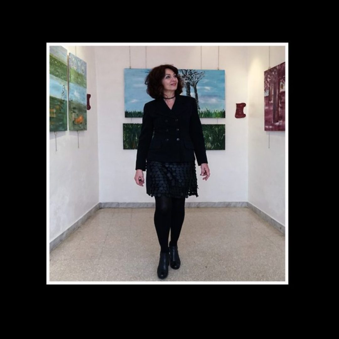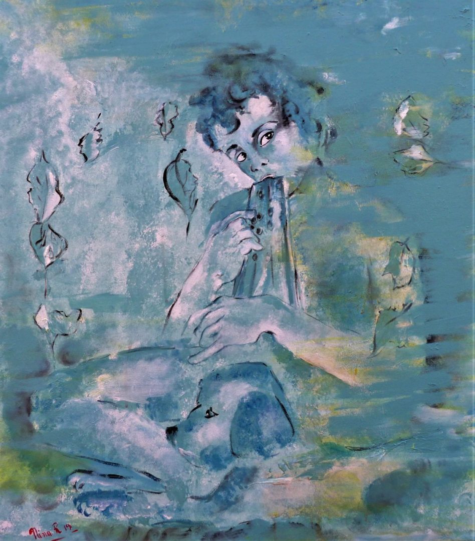 Nata a Mirandola in provincia di Modena Nina Razzaboni è cresciuta sbirciando la zia artista nel suo studio. Impregnandosi di aromi di oli e sprofondando tra i colori è andata aumentando la sua curiosità verso il mondo delle arti visive e verso quella speciale alchimia che nasce tra tele e colori, tra visioni e materia. Solo dopo il trasferimento a Roma inizia a studiare arte frequentando tra il 1995 e il 2000 la Scuola d’Arte Martenot del Maestro Loris Liberatori. Ad affascinarla sono da sempre le grandi opere dei maestri rinascimentali nei quali l’armonia delle forme e dei colori la portano verso una ricerca creativa che vede l’incontro tra un’estetica classica e un sentire contemporaneo. Appaiono così nelle sue opere, tra drappeggi e ritratti dai volti delicati, le scritte tipiche della writing art. Di Picasso ammira il gusto per la scomposizione che la porta a lavorare in moduli. Nel corso degli Anni ’90 approfondisce gli studi di PNL secondo le ricerche di Betty Ewards. Il rapporto tra arte e funzionamento del cervello diventa argomento di diversi corsi che terrà a Roma. Qui sperimenta il disegno capovolto che permette uno sguardo diverso sul proprio lavoro in quanto l’emisfero sinistro del cervello non riconosce immediatamente le forme e l’emisfero destro, quello artistico-creativo, riesce quindi a lavorare con una maggiore immediatezza.