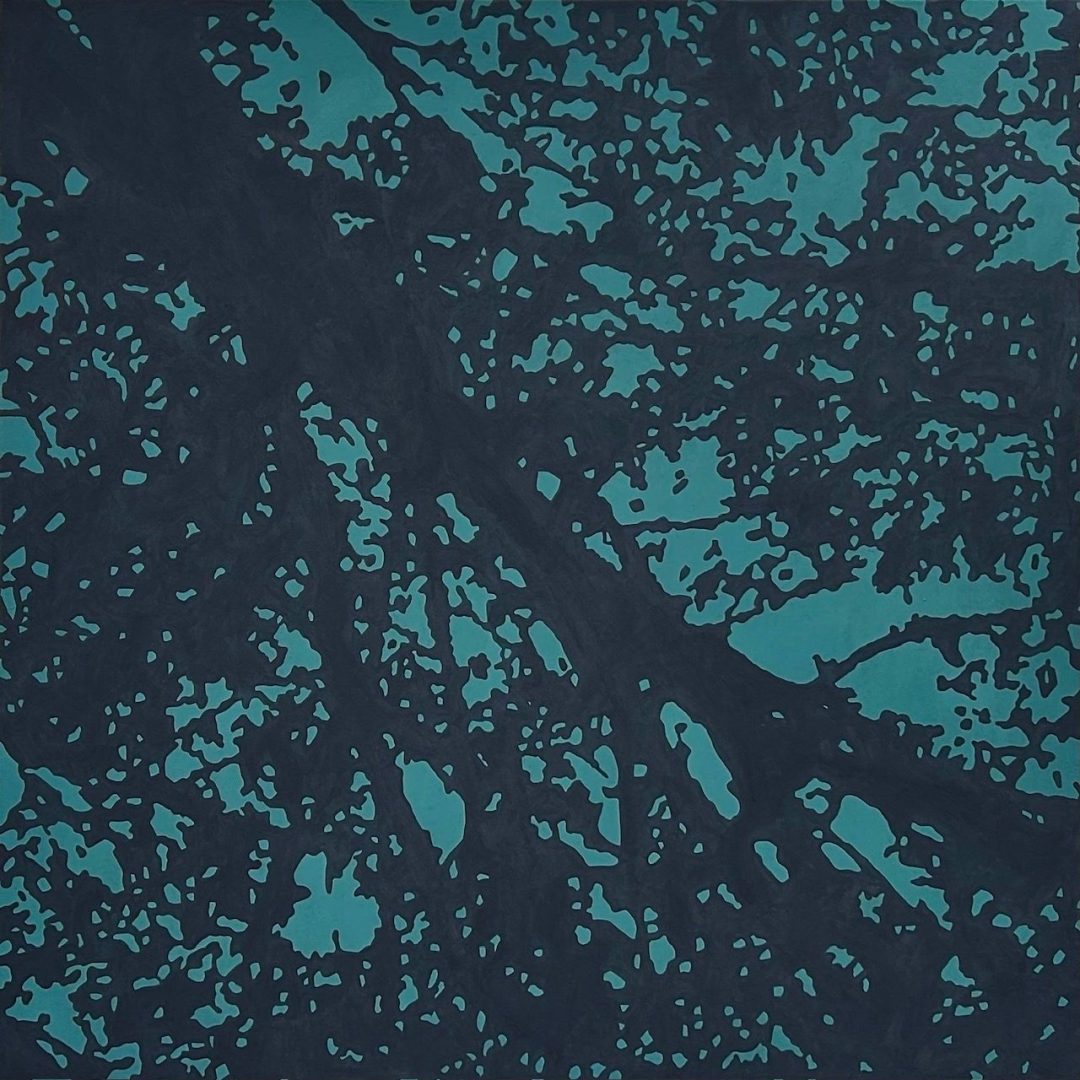 Sulle tele, con una precisa casualità, gli elementi naturali rappresentati dall’artista con il medium della pittura, della sabbia e dell’oro, si uniscono e separano formando geografie immaginarie e immaginifiche.