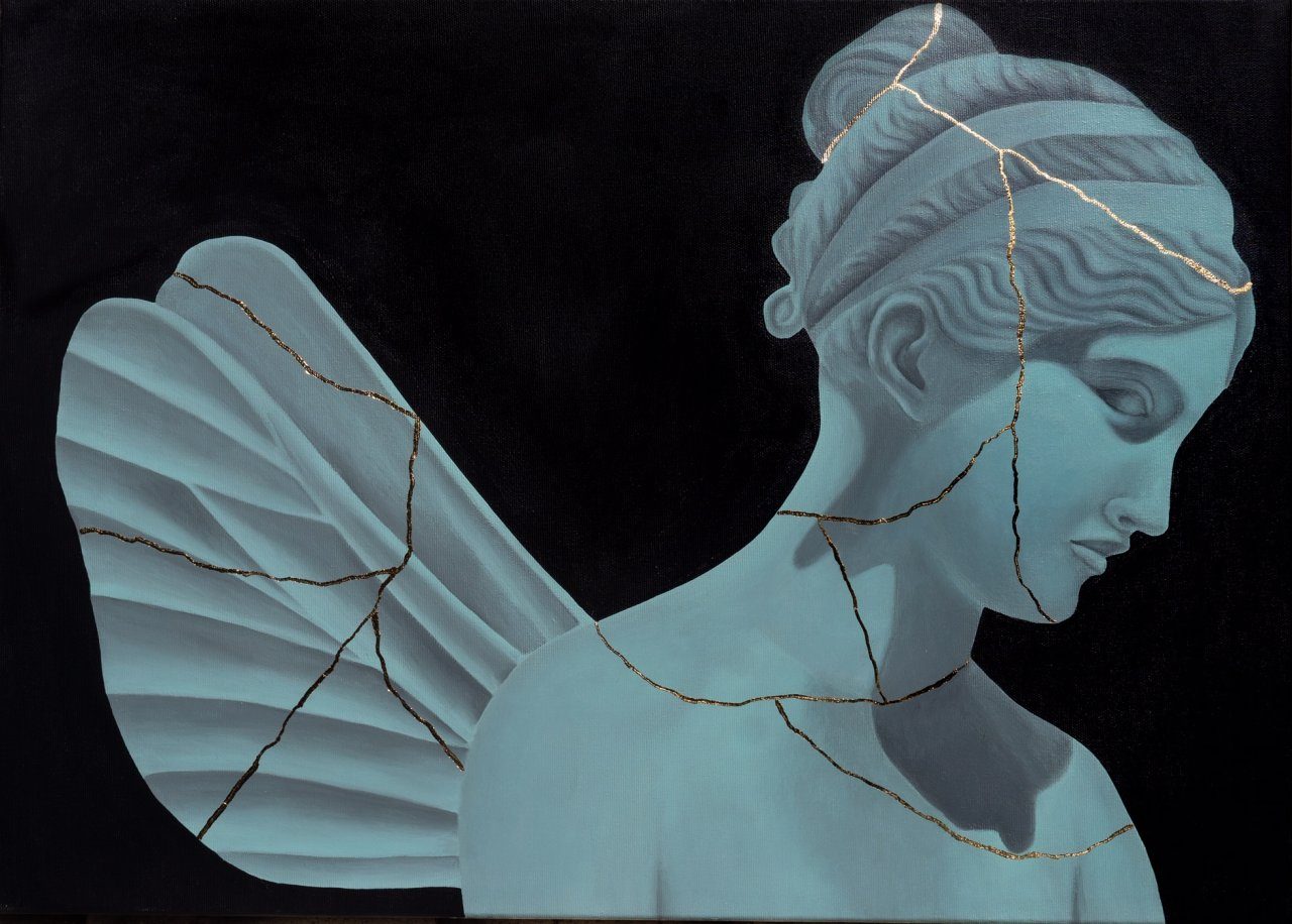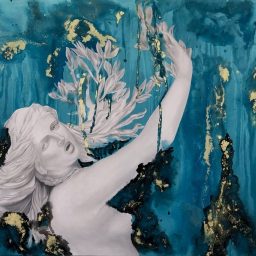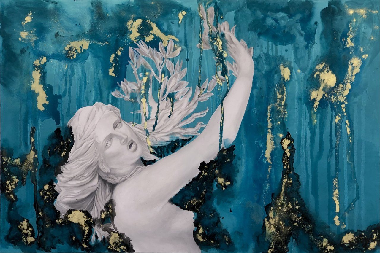Ho guardato alle donne, donne che aspettano, che osservano, donne che conoscono e cambiano il mondo. È iniziato tutto dallo studio del linguaggio del corpo femminile, gambe ritratte in posizioni che esprimono stati d’animo intimi e personali. Immagino queste scene come frammenti in cui il tempo non esiste più, o è sospeso per un istante in un ricordo onirico.Negli anni, questo studio mi ha portato a cambiare punto di vista: ho guardato alla natura come a una donna che resiste, genera vita, protegge, punisce e perdona. Mi sono ispirata ad icone storiche e mitologiche per cercare in quelle vite di fantasia delle morali differenti da quelle classiche e canoniche, volgendole al femminile e analizzandole.Nel mito di Amore e Psiche sono la volontà di conoscenza e il coraggio a muovere Psiche, che con forza e indipendenza affronterà prove difficilissime. Questo lungo percorso non soltanto la condurrà a ritrovare il suo amato ma, ancora di più, se stessa, fino al raggiungimento della parità con Amore, nel momento in cui verrà trasformata in Dea.Ho riflettuto su quanto ancora oggi molte donne siano in difficoltà e non trovino la forza di reagire, ripartendo da loro stesse.Tra i diversi miti dai quali avrei potuto prendere spunto per trattare l’argomento, uno in particolare mi ha colpito.Ho riletto in chiave contemporanea la vicenda di “Apollo e Dafne” tratta da Le Metamorfosi di Ovidio. Dafne è una giovane ninfa, una donna che ha fatto voto di castità a Diana, ma dietro questo voto non si celano messaggi religiosi, bensì una necessità di emancipazione da una realtà di uomini, violenza e violazione della propria libertà.