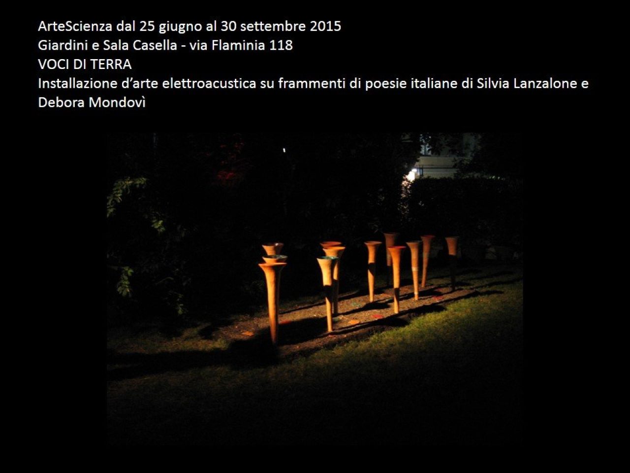 Installazioni sonore 2002 Roma, ‘Centro Sociale Casale Podere Rosa’, installazione musicale 2002 Roma ‘Teatro Sala Uno’, ‘Molteplici Virtuali’ XXV Stagione di Concerti nell'ambito di Progetto Musica: ‘Reflexioni, interazioni tra suono e forma’ 2005 Roma, Auditorium Goethe Institute, Festival Scelsi, opera scultorea per l'esecuzione del brano Solo di Fausto Sebastiani 2006 Roma, Ex Mattatoio, Scuola Popolare di musica di Testaccio, ‘Freon Laboratorio’, installazione di Mondovì 2007 Roma, Accademia di Romania ‘Spaziaperti5’, installazioni sonore Voce Solitaria e Risonanze dalla Terra in collaborazione con i compositori F. Sebastiani e S. Lanzalone. 2008 Roma, Conservatorio di Musica S. Cecilia “Emufest 2008 Festival Internazionale di Musica Elettroacustica” installazione sonora “Risonanze dalla Terra” di S. Lanzalone e D. Mondovì. 2009 Roma, Conservatorio di Musica S. Cecilia “2009 Emufest Festival Internazionale di Musica Elettroacustica” installazione sonora “Foglie di terra e di suono” di S. Lanzalone e D. Mondovì 2009 Roma, I.S.A XIII Premio Internazionale Massenzio Arte, installazione sonora Terra,Acqua,Suono. 2010 Salerno “Terra delle Risonanze” installazione d’arte elettroacustica presso Il Giardini della Minerva nell’ambito della settimana italiana delle arti 2010 Latina, Conservatorio di musica Ottorino Respighi “Le forme del suono” installazione elettroacustica (Lanzalone/Mondovì) 2010 Riofreddo – Museo delle culture Villa Garbaldi installazione sonora e laboratorio didattico all’interno della rassegna Romantik – anteprima, i concerti del 47° festival di Nuova Consonanza nella Comunità Montana dell’Aniene 2010 Roma Accademia Americana - Villa Aurelia - Terra delle Risonanze installazione d’arte elettroacustica con sculture risonanti, spazi performativi e documentazione fotografica all’interno della rassegna Romantik, i concerti del 47° festival di Nuova Consonanza. 2011 Musei di Villa Torlonia Casina delle Civette Roma Terra delle Risonanze - frammenti laboratorio didattico con esposizione di opere in ceramica ed installazione d’arte elettroacustica progetto a cura di Debora Mondovì installazioni a cura di Terra & Bits - gruppoartelettroacustica 2011 48° festival di Nuova Consonanza RiModulAzione american academy villa aurelia Voci di Terra installazione d'arte elettroacustica su frammenti di poesie italiane. Progetto e realizzazione a cura di Terra & Bits - gruppoartelettroacustica musiche di Silvia Lanzalone, sculture di Debora Mondovì, voce e adattamento testi Silvia Schiavoni. 2013 Museo Civico Archeologico di Tolfa (Rm), 1^ edizione dell’evento from pottery to “plastic” ceramisti/artisti norvegesi, finlandesi e italiani. Mondovì e Lanzalone partecipano al convegno con l’intervento: “Terra delle risonanze, descrizione del progetto e dell’istallazione”. 2014 mensione speciale per il concorso internazionale di arte contemporanea Immagine a place where … un’opera d’arte per Castello di Postignano, Sellano (PG). 2014 , 51 Festival di Nuova Consonanza Voci e Sguardi: mostra-installazione di arte, musica e poesia contemporanea. presentano Voci di Terra installazione d’arte elettroacustica su frammenti di poesie italiane e Voci d’amore installazione d’arte elettroacustica su poesie d’amore di A. Merini e A. Pozzi - Casa della Cultura di Villa de Sanctis, Via Casilina 675 – Roma 2015 – arteescienza, manifestazione internazionale di arte scienza e cultura contemporanea, “Voci di Terra” installazione d’arte elettroacustica su frammenti di poesie italiane - Accademia Filarmonica Romana, Roma – 2016 - settembre, nell’ambito della rassegna Anemòs, my sweet love's flower, progetto teatrale nei siti archeologici in collaborazione con la Soprintendenza della Regione Campania e direzione artistica di Sista Bramini, presso Antro della Sibilla, Cuma (NA), PRIMA NAZIONALE Sibille istallazione performativa con V. Pavani, C. Taglietti e V. Turrini. istallazione sonora di G. Natalini, opere in terracotta di Debora Mondovì, drammaturgia e regia Sista Bramini 2017 – Conservatorio G. Martinucci di Salerno - Caleidofonie – VII Festival Internazionale di Musica Elettronica ed Elettroacustica – Villa Guariglia a Raito di Vietri sul Mare (Sa)