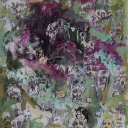 - Città: inchiostro e acquerello su carta, raffigura una processione di figure in cerca di intercessione divina. Tra le evanescenze violacee, una ragazza hippy sorride.