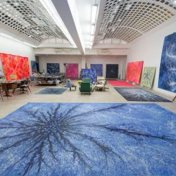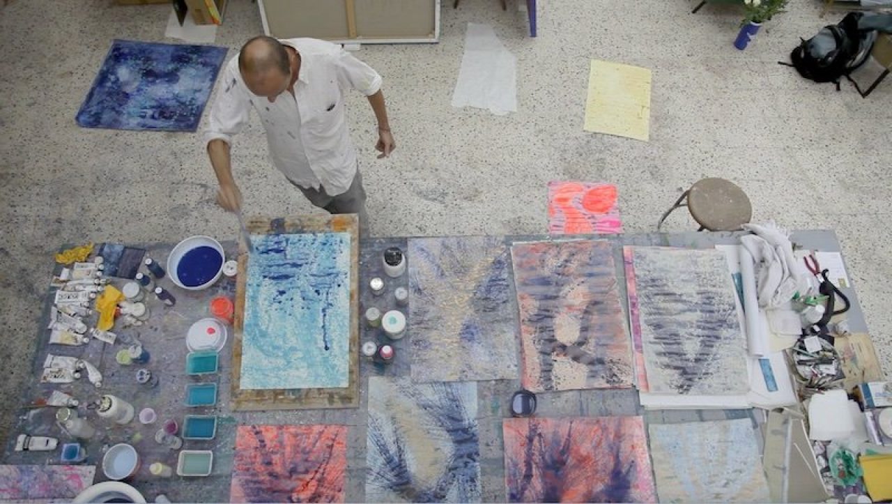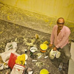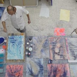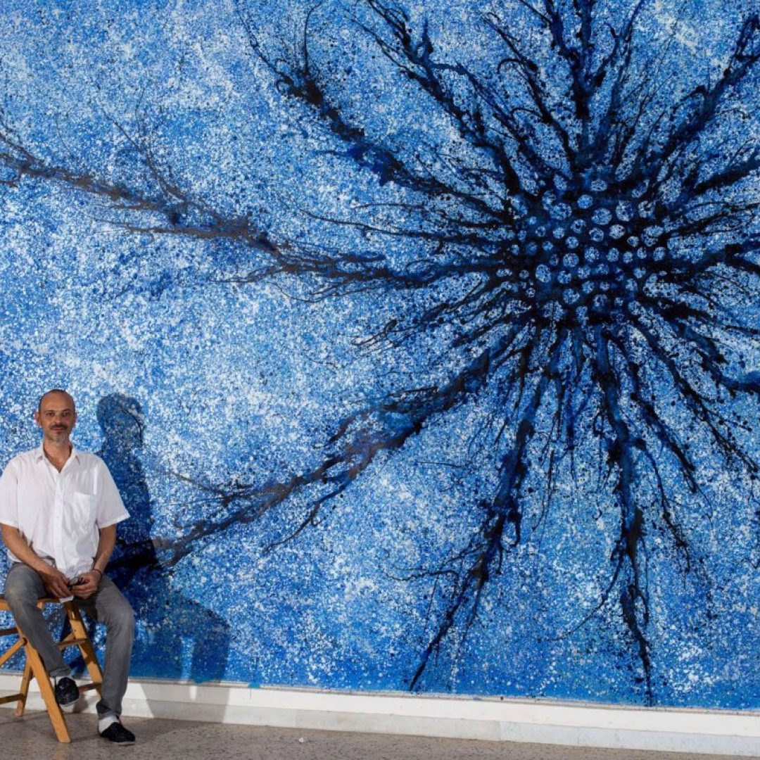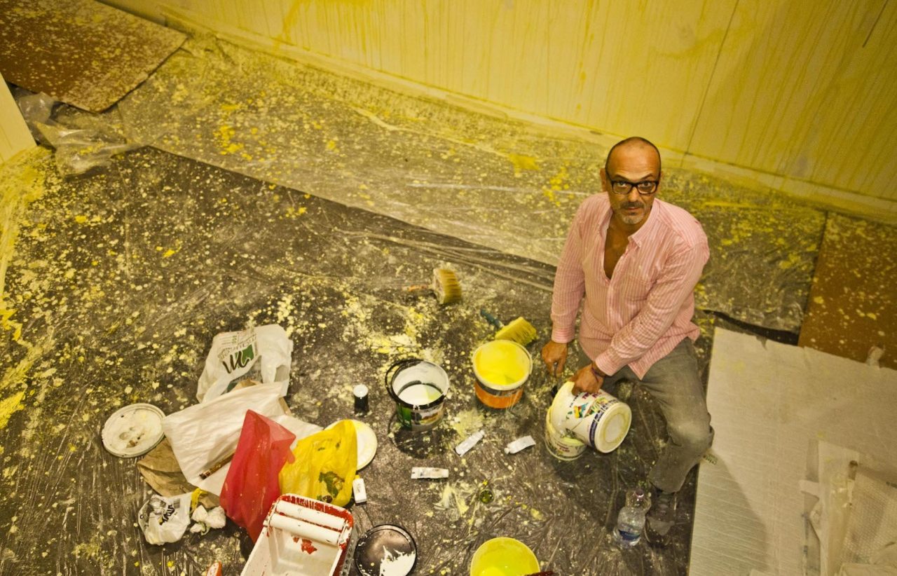 Alberto Di Fabio trae ispirazione dal cosmo e dagli elementi che compongono il mondo della natura. La sua pittura indaga su reazioni chimiche, fusioni minerarie, atomi, il DNA, il sistema neuronale, ingrandendoli come sotto un microscopio. Queste forme spesso geometriche girano e vibrano sulle sue tele in colori brillanti e puri, creando contrasti e scale armoniche, variazioni tonali e accostamenti sorprendenti che coinvolgono lo spettatore in visioni cinetiche extrasensoriali. Nasce ad Avezzano (AQ) nel 1966. Seguendo le orme del padre artista, Pasquale Di Fabio (1927-1998) e della Madre Delia insegnante di scienze naturali, Alberto si avvia verso la pratica creativa, si trasferisce a Roma ove segue i corsi del Liceo artistico di via di Ripetta (1980-1984) e dell’Accademia di Belle Arti (1984-1988) che integra con quelli dell’Accademia di Belle Arti di Urbino ove si dedica all’incisione (1985). Il suo apprendimento è, inoltre, alimentato da ripetute viste alla Galleria nazionale d’arte moderna di Roma. ove si reca al termine delle lezioni in Accademia per ammirare i maestri del XX secolo. Nel 1989 partecipa con due serie di opere, “Montagne rosse” e “Fusioni minerarie”, ad una mostra collettiva promossa dalla galleria Alessandra Bonomo di Roma. Nell’occasione conosce Sol Lewitt e Alighiero Boetti il quale acquista un’opera e lo incoraggia a proseguire nel suo percorso. L’episodio segna l’inizio di un rapporto di reciproca stima tra i due e quando Boetti sollecita Di Fabio a completare la propria formazione fuori Roma egli ascolta il suo suggerimento e si reca a Parigi (1992-93) presso la Cité des Arts. Sull’onda di questa esperienza, e animato dai consigli di Boetti, oltre che di Cy Twombly al cui magistero Di Fabio guarda con altrettanta ammirazione, egli decide di ampliare ulteriormente i propri orizzonti culturali e nel corso degli anni Novanta, compie ripetuti soggiorni a New York, rimanendo affascinato dall’espressionismo astratto Americano. Qui entra in contatto con Richard Long Ross Bleckner, Ed Ruscha, Jenny Saville, e ritrova Donald Baechler, Philip Taaffe conosciuti da Lucio Amelio a Napoli in occasione della mostra Trismegisto a cui partecipa nel 1993. Nel 1994 ha luogo la sua prima personale, Il profilo insonne della terra, nella galleria Stefania Miscetti di Roma. Al 1996 risale, invece, la sua prima personale presso una pubblica istituzione, il Rupertinum di Salisburgo, seguita, un anno dopo, da quella presso il Kunstverein di Bregenz, incentrata sul ciclo intitolato “Mondo subatomico” al quale egli si dedica per tutto il nono decennio. Sempre nel 1996 viene invitato per la prima volta alla Quadriennale di Roma ove farà ritorno nel 2003 e nel 2008. Nel corso delle sue permanenze a New York Di Fabio avvia una intensa attività espositiva; tra l’altro, partecipa alla rassegna The Return of Exquisite Corps a The Drawing Center Museum(1993) ed espone in veste individuale alla galleria Alexandre de Folin. In tale circostanza, Larry Gagosian acquista quattro suoi dipinti avviando una collaborazione professionale culminata in una serie di mostre personali presso varie sedi della Gagosian Gallery (London, 2002, 2007; Beverly Hills, 2004; New York, 2010; Athens, 2011; Geneve, 2014). Nel 2001 rientra stabilmente a Roma pur mantenendo lo studio a New York ove si reca ripetutamente. Il ritorno in Italia coincide con un intensificarsi della sua presenza sulla scena pubblica nazionale sia a livello individuale (galleria Umberto Di Marino, Napoli, 2004, 2007, 2011, 2017; galleria Pack, Milano, 2005, 2007, 2010; Edicola Notte, Roma, 2009) che collettivo (partecipa, ad esempio, a Napoli Presente, Pan, Napoli, 2005; Cara domani, Bologna, Mambo, 2012; Nell’acqua capisco, evento collaterale alla 55 Biennale di Venezia, 2103), oltre che su quella internazionale (è invitato, tra l’altro, alla Biennale di Pechino nel 2005 e a Dublin Contemporary, National Gallery, Dublin, 2011). All’aprirsi del nuovo Millennio la ricerca di Di Fabio prosegue nei suoi interessi per i temi della scienza e della fisica come testimoniano i cicli pittorici delle “Sinapsi”, dei “Neuroni”, dei “Quanti”, degli “Atomi”, delle “Molecole”, dei “Campi magnetici” che lo accompagnano alternativamente per tutto il primo decennio del Duemila. Nello stesso periodo prende avvio il suo confronto con le problematiche sociali che lo porta a realizzare nel 2003 la serie “Vouge world” compiuta rielaborando in toni surreali riviste illustrate di moda; oppure, ispirato idealmente da Joseph Beuys, quello con le questioni ecologiche che si concretizza nel 2004 nell’azione Ri-impianto compiuta sul territorio dell’isola di Ponza; oppure a cimentarsi col mondo dello spettacolo e del Video con la progettazione di “animation paintings” per le scene del tour musicale di Heather Nova nel 2013. In occasione dell’edizione 2010 del Premio Michetti viene insignito del premio Dante Ruffini e Maddalena Pettirosso, (per le relazioni dei suoi dipinti con il mondo della fisica e astrofisica) dall’astrofisico Remo Ruffini. Il biennio 2012-13 lo vede protagonista di una trilogia espositiva monografica che ripercorre emblematicamente i luoghi e i motivi della sua formazione e fa tappa alla Galleria Nazionale d’Arte Moderna e Contemporanea di Roma poi, nel 2013, alla Estorik Collection di Londra ed alla Mairie du 4eme, di Parigi. Nel 2014, tiene una conferenza e mostra personale presso il CERN di Ginevra, poco dopo Castel Sant’Elmo a Napoli e la Fondazione Menegaz di Castelbasso gli riservano un’ampia rassegna antologica, Il 2015 lo vede protagonista di due grandi personali, al MART di Rovereto e al Macro Testaccio di Roma. Nel 2016 espone a Ferrara in diverse sedi prestigiose come il Palazzo Dei Diamanti Castello Sforzesco e la Porta Degli Angeli, concludendo l’anno con una personale nella galleria Milanese di Luca Tommasi e la pubblicazione del suo primo romanzo “