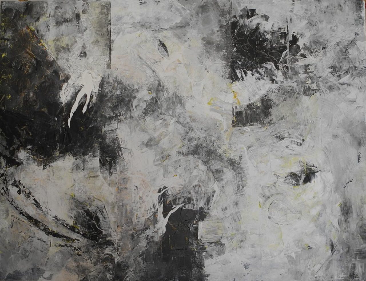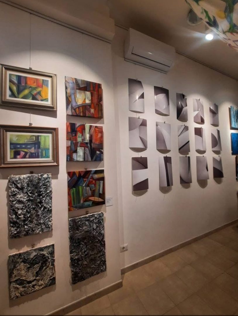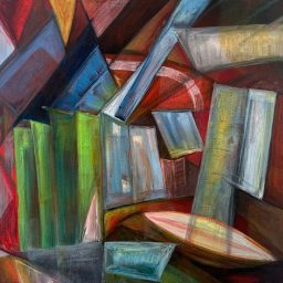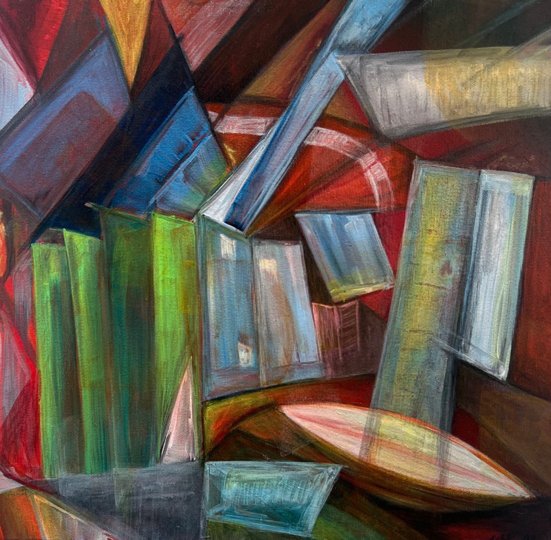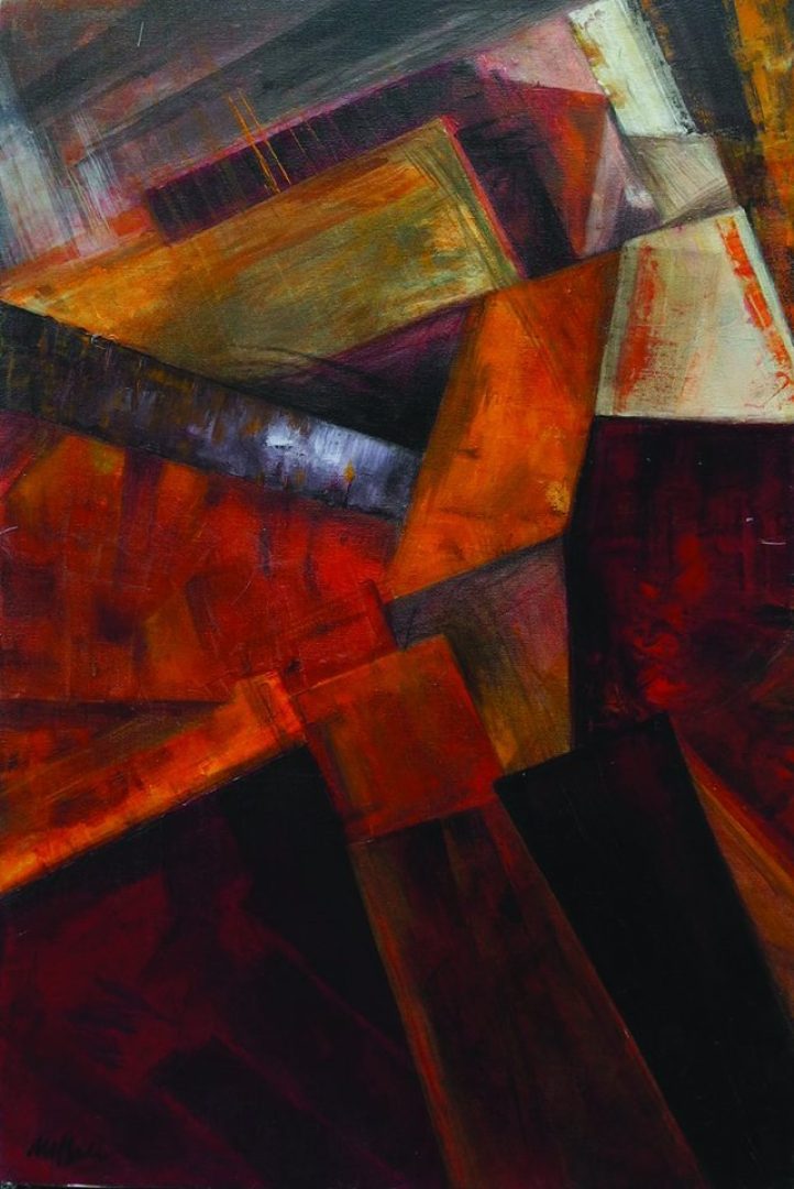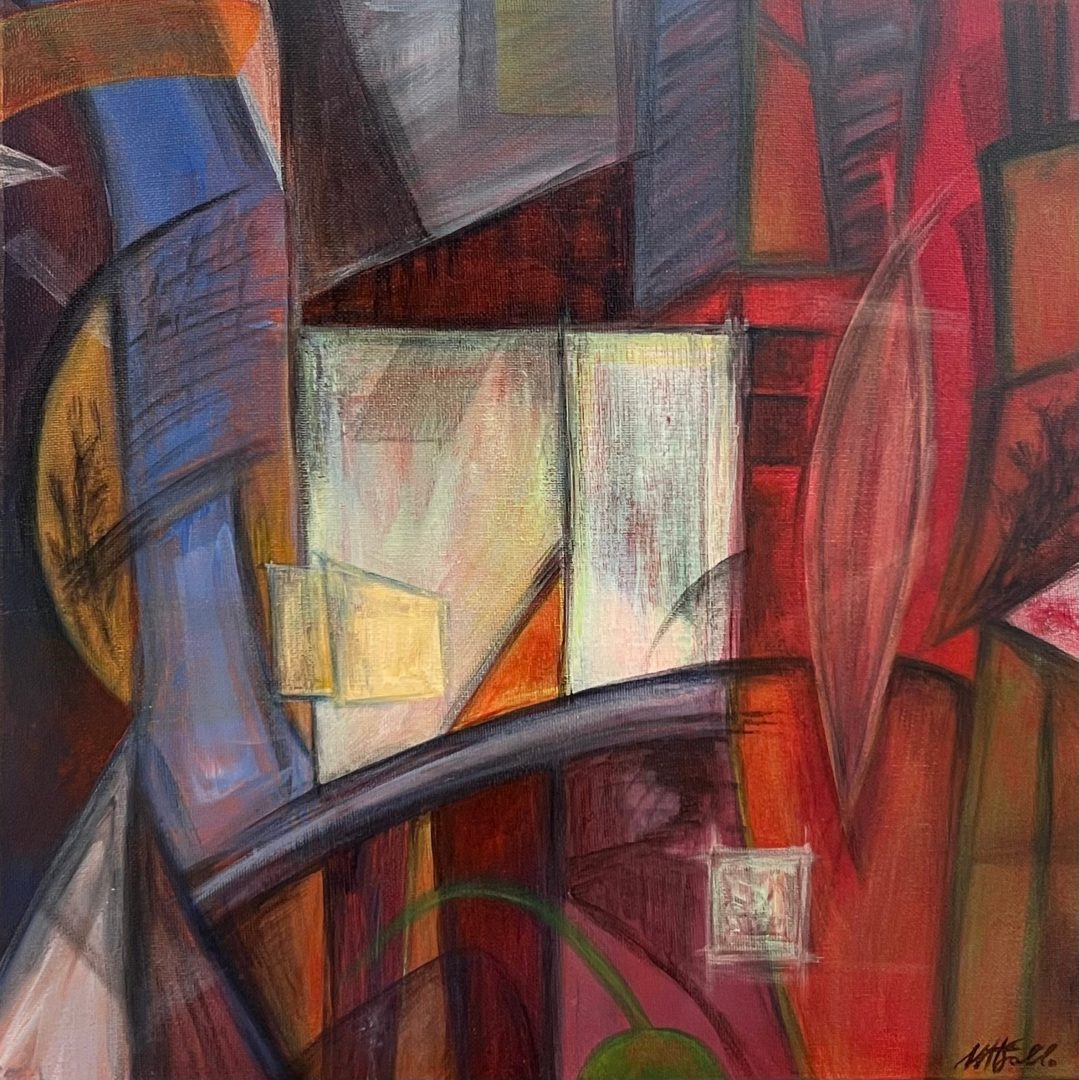 Gli acrilici su tela, in bilico tra geometrismo e informale rappresentano la mia visione di altre dimensioni, uno sguardo personale e onirico che si traduce in immagini geometriche, segni e sfumature.
