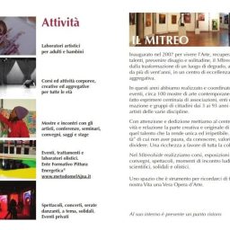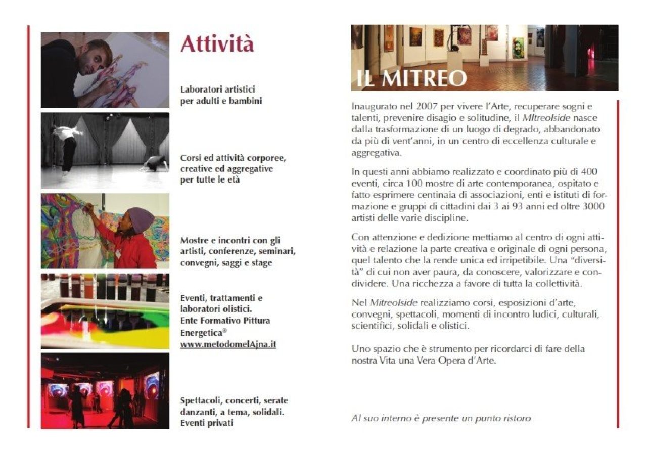Spazio polivalente e polifunzionale che ospita quotidianamente corsi e laboratori dei vari linguaggi dell’arte per bambini e adulti dai 3 ai 90 anni (arti visive, danza classica, contemporanea, popolare, teatro, artiterapie, canto, ecc. e migliaia di ore offerte gratuitamente a soggetti svantaggiati affinchè abbiano pari opportunità), è nato con l’intento di contribuire a rimettere al centro della contemporaneità il valore sociale e propulsivo dell’arte. Si è contraddistinto nel tempo per aver attratto e messo in rete le risorse creative, culturali ed economiche del territorio municipale e cittadino tanto da realizzare, in sinergia con altre associazioni, singoli professionisti e strutture pubbliche e private circa 600 eventi (di cui oltre 120 esposizioni d’arte personali e collettive; concerti, spettacoli, intrattenimento, convegni e conferenze, presentazione di libri, e molto altro) e di cui più del 50{fdfb762007aad77daa7217a77e1407505f4231909a259d03c925c58a56f3f475} ad ingresso libero e gratuito. E’ divenuto negli anni un importante punto di aggregazione e riferimento culturale anche grazie alla risposte degli artisti: oltre 3000, di provenienza e livello anche internazionale, lo hanno scelto per dare visibilità alle loro opere/esibizioni. ,Nel 2024 la MitreoIside aps ets ha organizzato, in collaborazione con l'associazione MI.C.RO di Salvatore Carbone una eccellente mostra "Giulio D'Anna e gli aeropittori Italiani" che, con le sue 70 opere di artisti del calibro di Giacomo ed Elica Balla, Tullio Crali, Tato, Dottori, Prampolini, Depero, dello stesso D'Anna, Andreozzi, Ambrosi, Fillia, Canevari, Baldessari, Sibò, Benedetto, Bruschetti, Gambini, Dulgheroff, Venna, Di Bosso, Delle Site, Ciacielli, Duse, Lepore, Mazzorin, Voltolina, Saladin, Di Lazzaro, Osvaldo Bot, Mario Gros e bel dieci opere di aeropittrici quali, Benedetta, Marisa Mori, Barbara, Leandra Angelucci Cominazzini, Adele Gloria, Magda Falchetto, ha richiamato appassionati da tutta Italia. In catalogo, testi dei curatori Maurizio Scudiero e Anna Maria Ruta, degli storici Giancarlo Carpi, Elena Gigli e Claudio Cantella, di Albertina D'Anna e dei direttori artistici Salvatore Carbone e Monica Melani. La mostra è stata possibile grazie ai prestiti di collezionisti privati, l'archivio dei Futuristi e di Baldessari di Rovereto, l'archivio Depero, il portale Futur-ism e gallerie quali: LeoGalleries, Matteotti, Lattuada e Pirra.