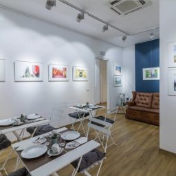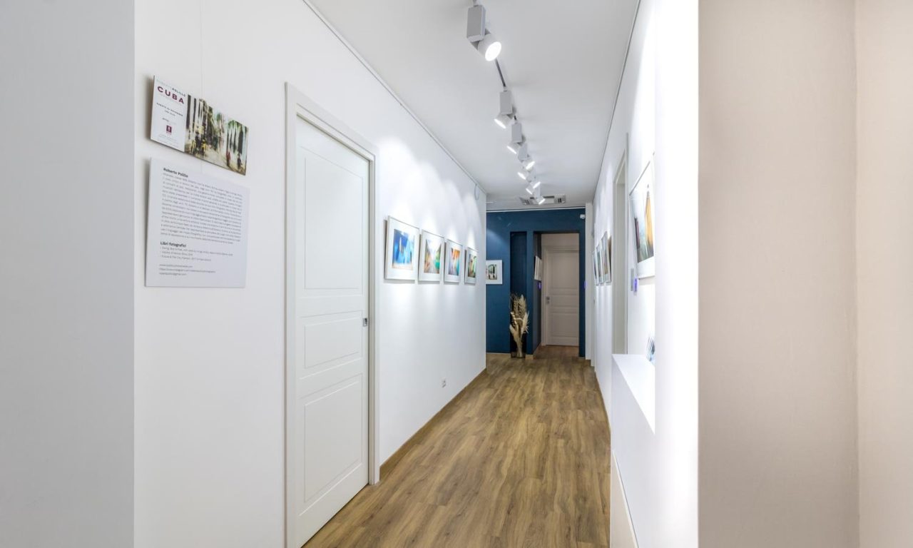 Lo stile è essenziale ma elegante, ogni particolare è stato studiato ad hoc, compreso l’allestimento dello spazio espositivo dotato, tra le altre cose, di binari per l’esposizione delle opere ed illuminazione, altamente professionali.